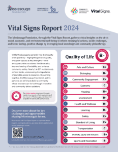 Vital Signs is a community report that combines national, provincial, and local data and incorporates residents’ public opinion research on important local issues. This comprehensive report serves as a catalyst for conversations among community members, leaders, and organizations in Mississauga, fostering collaboration and driving action on the matters that are most important to us.